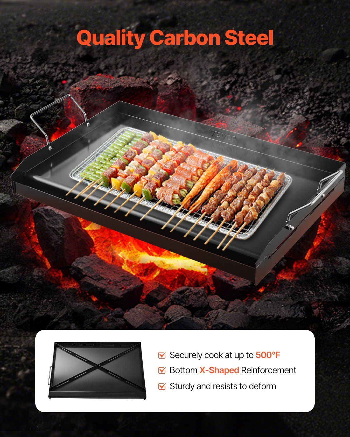 · Quality Carbon Steel: Made from durable carbon steel, this griddle for gas grill can handle temperatures up to 500°F, giving you the freedom to cook at high heat. The bottom x-shaped reinforcement resists to deform