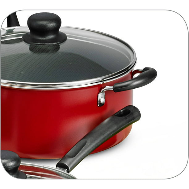 This 18-piece nonstick cookware set is an ideal starter kit for home cooks of every level. The patterned nonstick interior enables effortless cooking and hassle-free cleaning, and the set comes in two colors to match any kitchen decor. Dishwasher safe and made of lightweight aluminum, this set includes coordinating utensils and pots for practical and functional cooking. The stay-cool handles reduce the risk of burns while the transparent lids provide a clear view of your cooking progress. The Tramontina's Prima Ware 18-piece nonstick cookware set is compatible with most range types, making it a versatile addition to your kitchen.